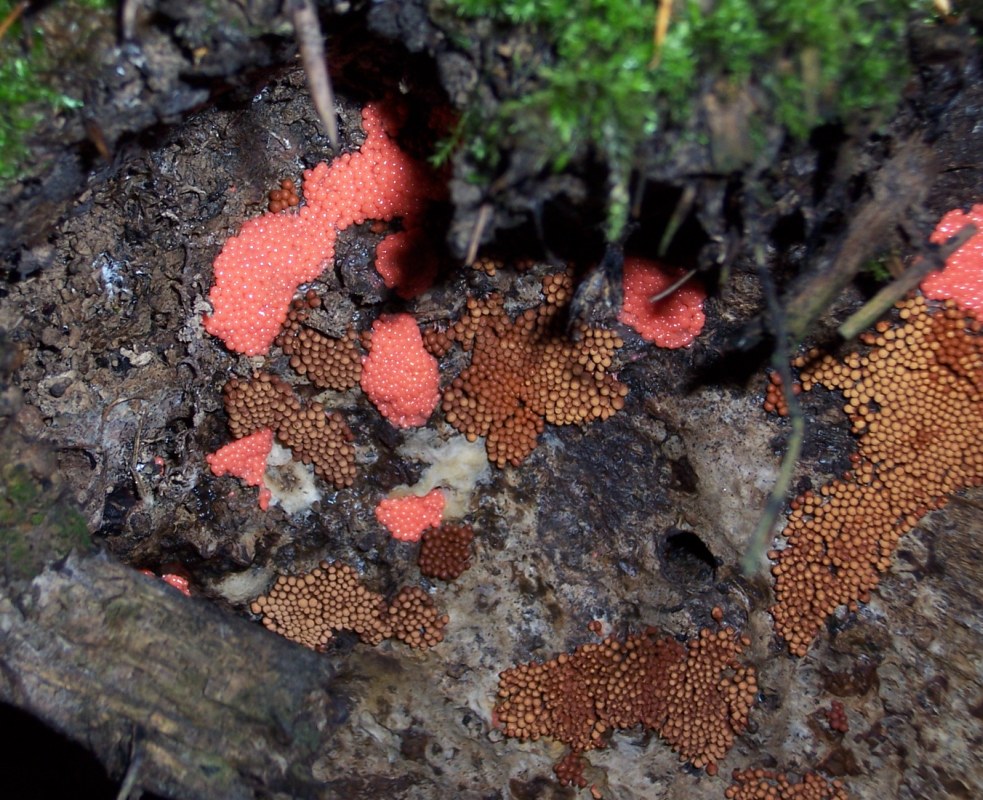 Die Gattung Trichia halte ich bei den Roten (Trichia decipiens?) und den Braunen auf Bild 3 für möglich, aber ohne aussagekräftigere Bilder und Angaben insbesondere zu den Braunen (auch mal von der Seite fotografieren und nicht nur von oben!) wird da sicherlich nichts zu machen sein. Schleimpilze in dieser Farbe gibt's jede Menge. Die Roten sind ja schön zu sehen, samt Stielchen. Sind die Stielchen rosa?