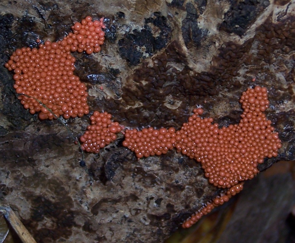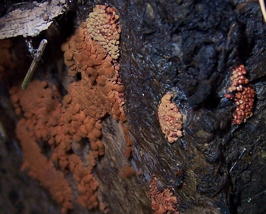 Leider ist ein Foto missglückt: unter einem vorspringenden Bereich hing ein Vorhang aus braunen Knubbeln. Beim leichten Berühren gab es viel braunen Sporenstaub und alles fiel herunter. Das war wie eine Mini-Explosion.