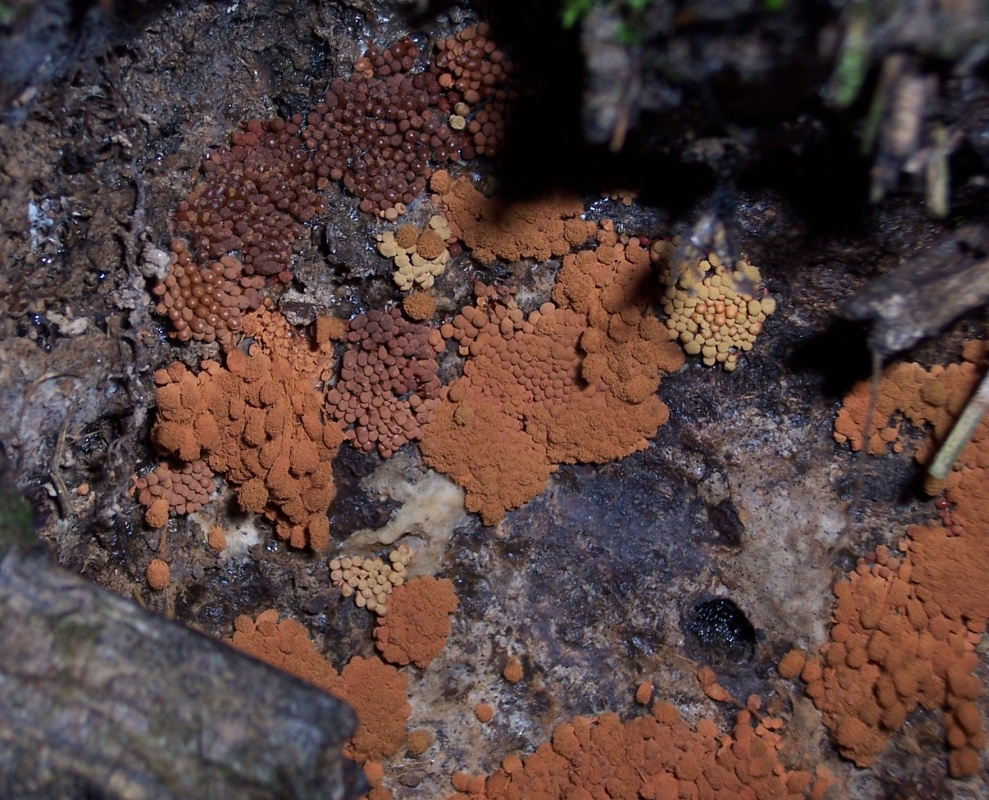 Die Schleimpilze auf Bild 5 sind für mich schwer einzuordnen, mit der Gelb-Braunen-Farbkombination und der Form habe ich etwas Mühe, würde aber sagen, dass wir es damit insbesondere wegen der Tropfenform zumindest mit zwei verschiedenen Arten zu tun haben.