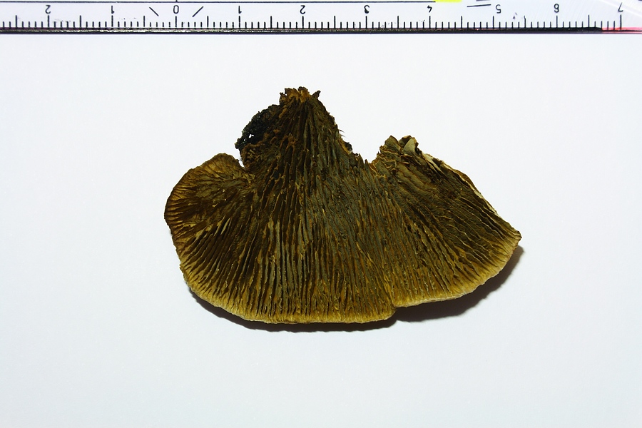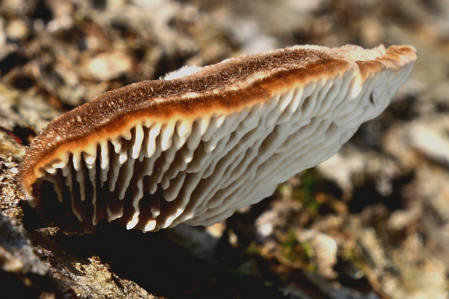 Für mich sollte es wegen des Substrates (Laubholz) eigentlich eine (laut Gerhardt) relativ seltene Art sein, nämlich ein Balken-Blättling (Gloephyllum trabeum), daran kann ich aber nicht so recht glauben, weil ich mir die langgestreckten Poren des Balken-Blättlings etwas enger angeordnet vorstelle.