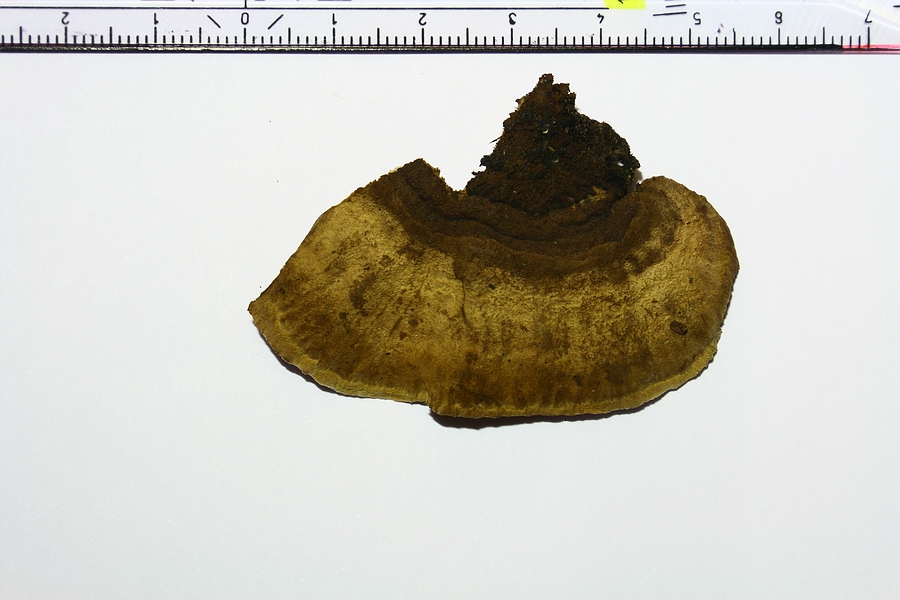 Der Pilz ist ca. 7 cm breit und ca. 3 cm vom Substrat abstehend. Die Oberseite ist deutlich striegelig-filzig, er sieht mehr oder weniger von oben aus wie eine Striegelige Tramete, die übrigens zu Hauf auf den Buchen-Stämmen außen rum gewachsen sind. Er ist ein Einzelstück!