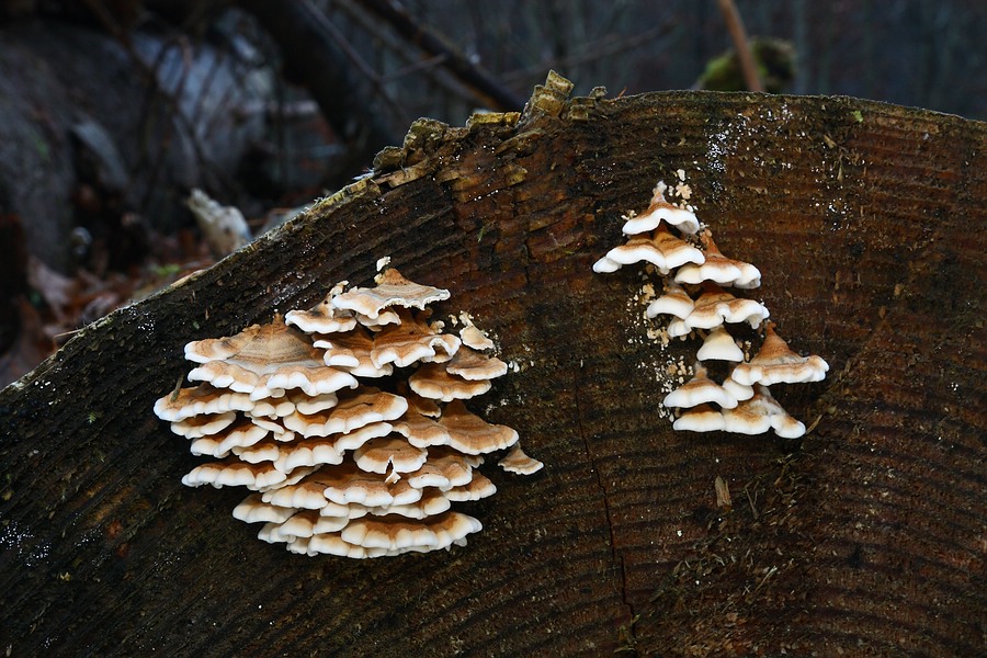 Die Pilze in der Übersicht (1. Foto) ganz rechts sind Trameten (evtl. Trametes serialis).