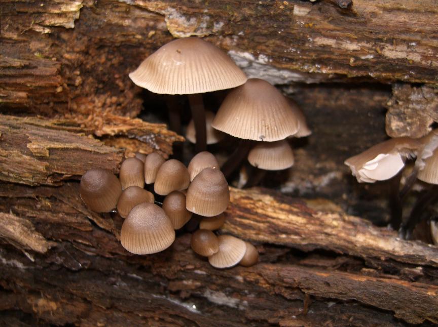 Ich ergänze mal noch Annas Bestimmungen um ein paar Ideen: Wenn du die Helmlinge (Pilz 1) abknickst, und da kommt roter Saft aus dem Stiel, dann sind Bluthelmlinge, Mycena Haematopus.