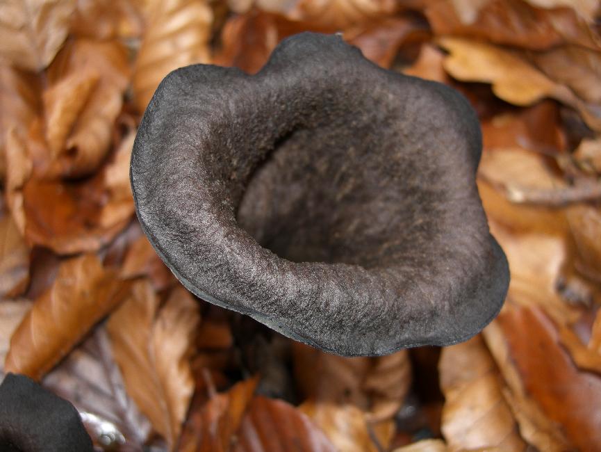 Dann unmittelbar daneben, Grauer Leistling (cantharellus cinereus). Von oben betrachtet im Laub fast gleich, anscheinend.