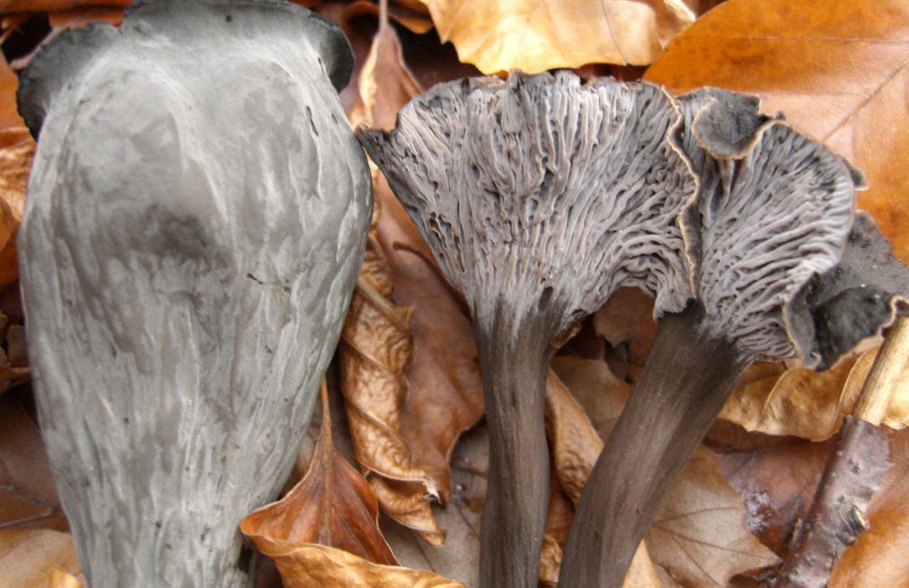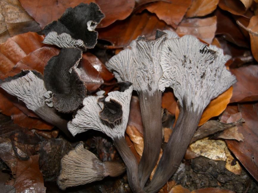 Als wir auf Herbsttrompeten stießen und sammelten, hatte ich auf einmal etwas anderers in den Fingern, was von oben fast gleich aussah. Die wenigen geplückten Exemplare vom Grauen Leistling nahmen wir mit, der Rest steht noch. Ein Grund ein paar Fotos zum Vergleich zu machen.