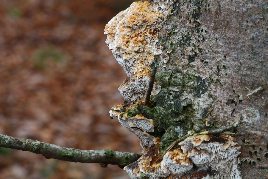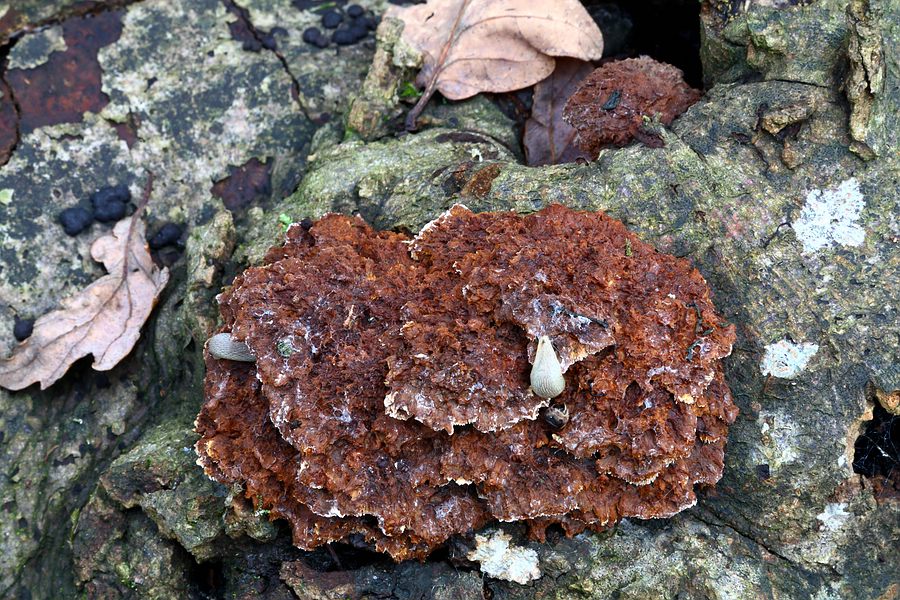 • Für mich erkennbare Begleitpilze: Krause Aderzählinge (Plicaturopsis crispa) und Kohlenbeeren