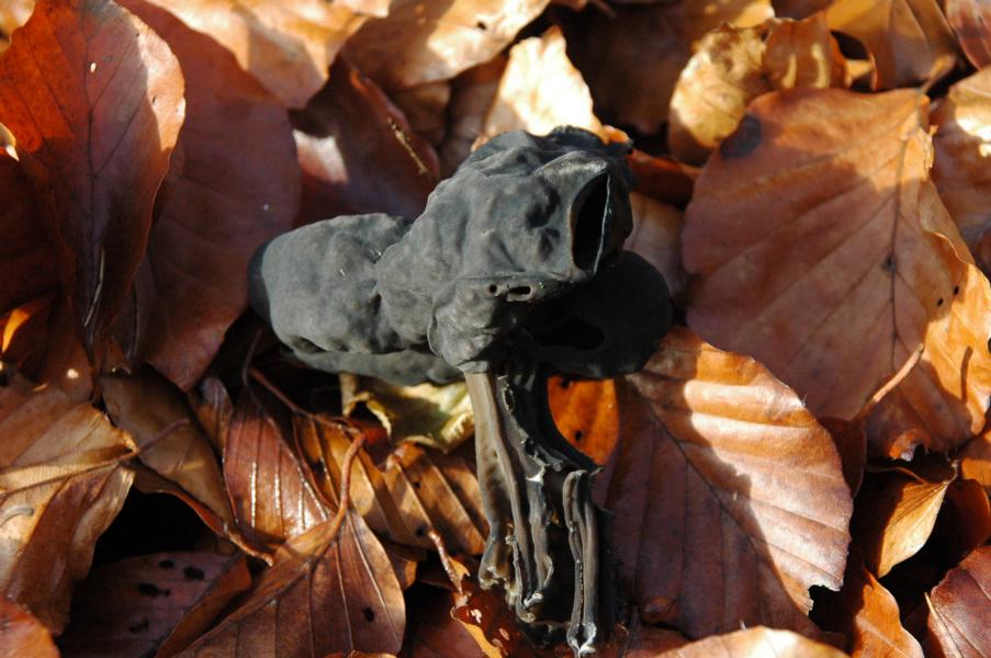 Das schwarze Dingens ist die Grubenlorchel, Helvella Lacunosa.