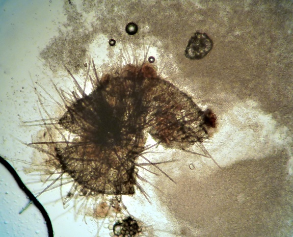 Kleine, aufsitzende,silbrig-schwarze Perithecien mit langen, septierten, dickwandigen Haaren besetzt. Asci waren nicht zu sehen.