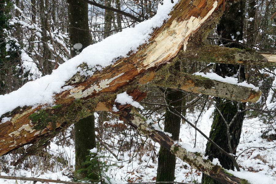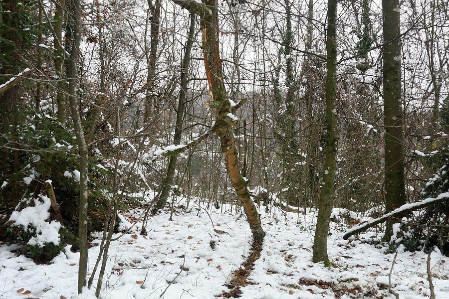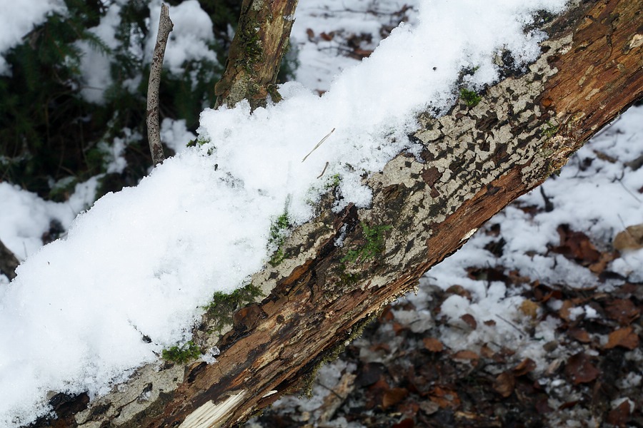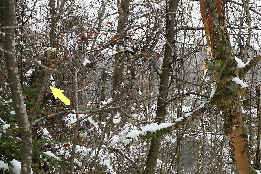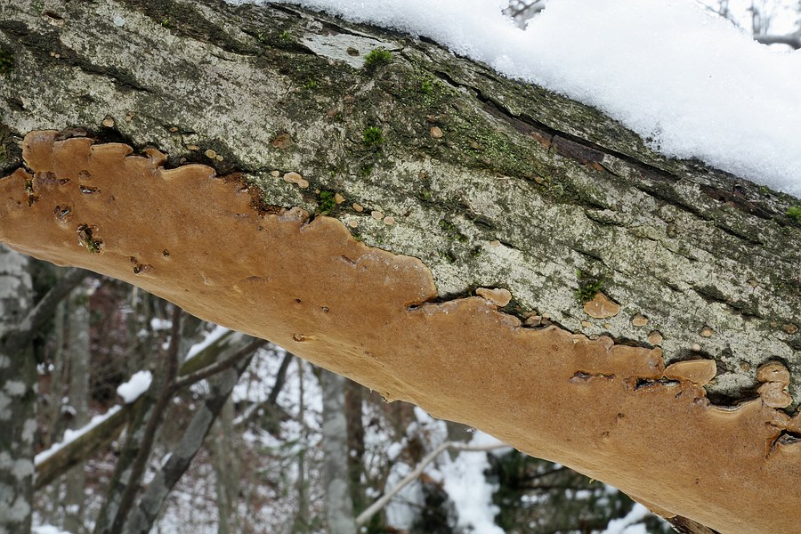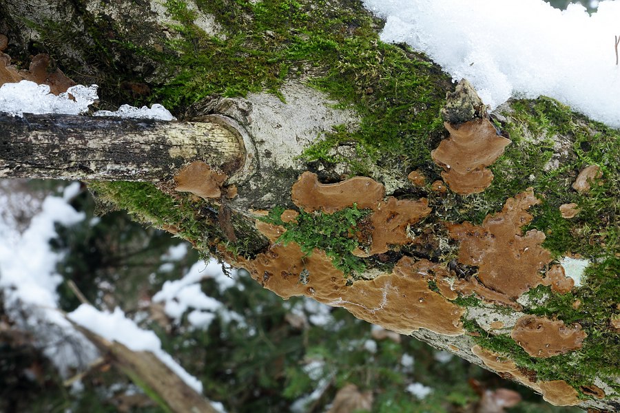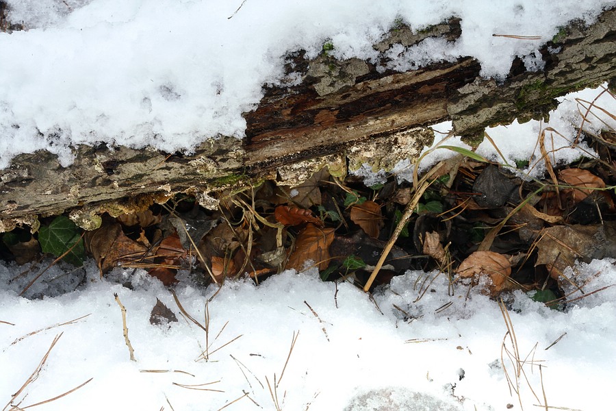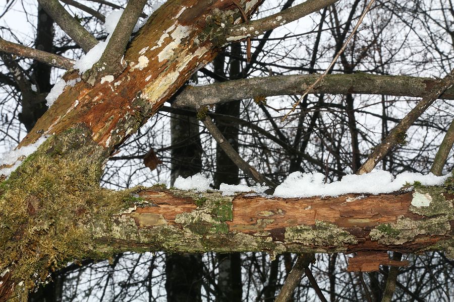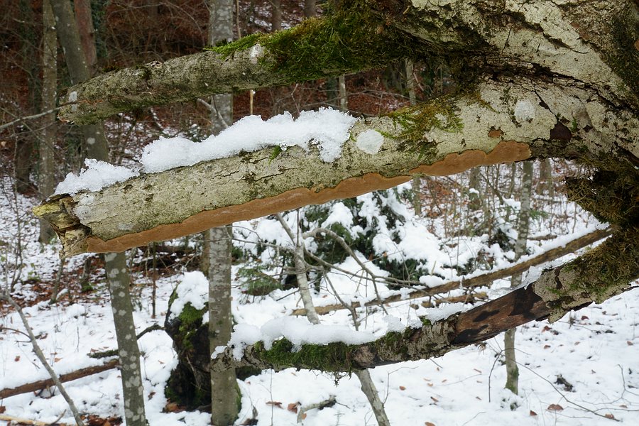 Hier der Fundort mit dem schrägliegenden, abgebrochenen oberen Teil eines Baumes, welcher als Substrat für den gesuchten Pilz dient. Der Pilz befindet sich tendenziell an der Unterseite des Substrates, dort nur an den dickeren Teilen, nicht oben im Geäst: