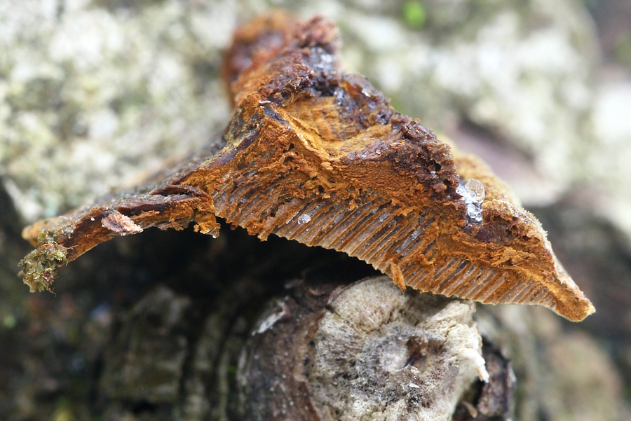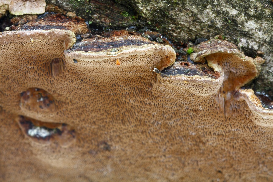 Vorgestern habe ich an unbekanntem Substrat (dazu später!) einen dünnen, flächigen Feuerschwamm (Phellinus) gefunden.