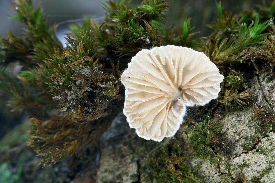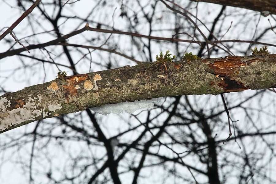 Hier ein dünnerer Ast (ca. 5 cm Durchesser) in ca. 3 m Höhe, daran sind Pilze zu erkennen, welche im Détail nachfolgend einmal von oben und einmal von unten gezeigt werden (gewachsen als Einzelexemplar an einem für mich zu erreichenden Ast, Breite: 7 mm):