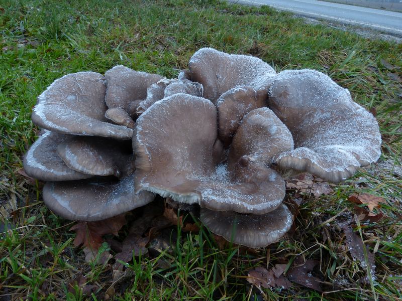 der Austernseitling kam mir wegen des verwachsenen Aussehens auch in den Sinn, das habe ich aber nicht ernsthaft erwogen, weil er eben auf Holz wächst. Auf dem Grünstreifen sind nicht mal Stümpfe von früheren Bäumen zu sehen, ich füge nochmal ein Foto an, wo man den Verlaufm von Straße und Radweg sehen kann.