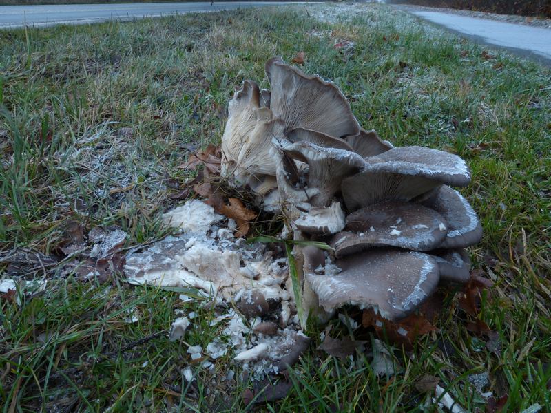 • Heute sah ich am Straßenrand vor Neustadt / Holstein im Vorbeifahren einen so großen Pilz, da mußte ich einfach anhalten. Dieser Riesenpilz wuchs auf dem Grünstreifen zwischen Fahrbahn und Radweg, mitten in der Feldflur, kein Wald in der Nähe, nur ein paar Sträucher jenseits des Radweges. Hutgröße einzelner Pilze bis 18 cm. Ich dachte erst an Nebelkappe, dann an irgendeinen Muscheling, aber die wachsen lt. Buch nur in Laub- und Nadelwäldern. Welcher Pilz ist das?