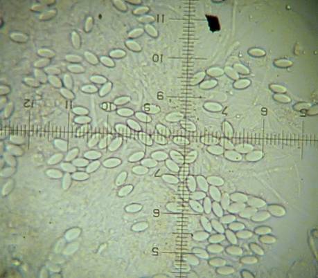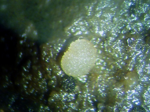 Das Apothecium ist schmutzig weiß, sehr flach, fast scheibenförmig.