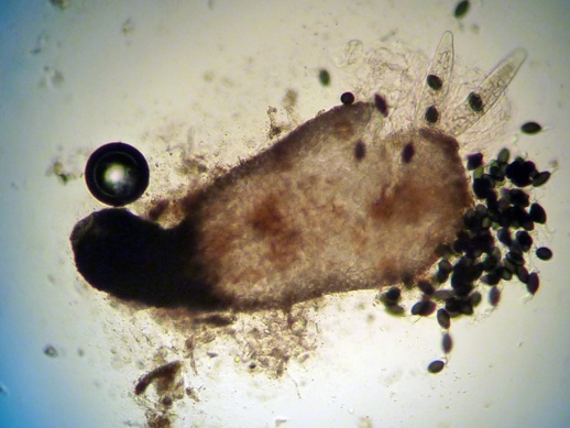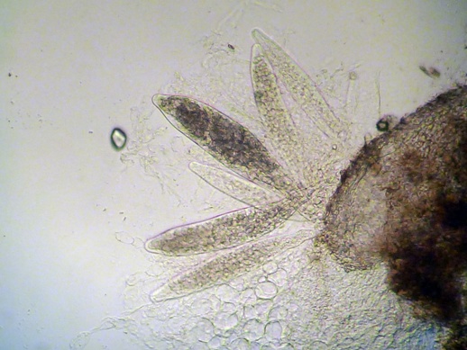 Der Pilz war schon überreif und keine Asci mehr zu sehen. Ich hab also nur die Sporen. Ich konnte auch keinen weiteren Fruchtkörper finden. Den Maßen und dem Aussehen nach könnte es Podospora pleiospora sein.