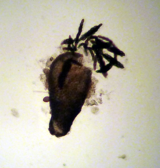 Die Asci lagen dicht übereinander und gaben kein gutes Foto. Drum hab ich nach dem Vermessen versucht, sie vorsichtig! etwas auseinander zu schieben. Das Resultat war, dass die Sporen in alle Bestandteile zerfielen. Sie sind also sehr instabil.