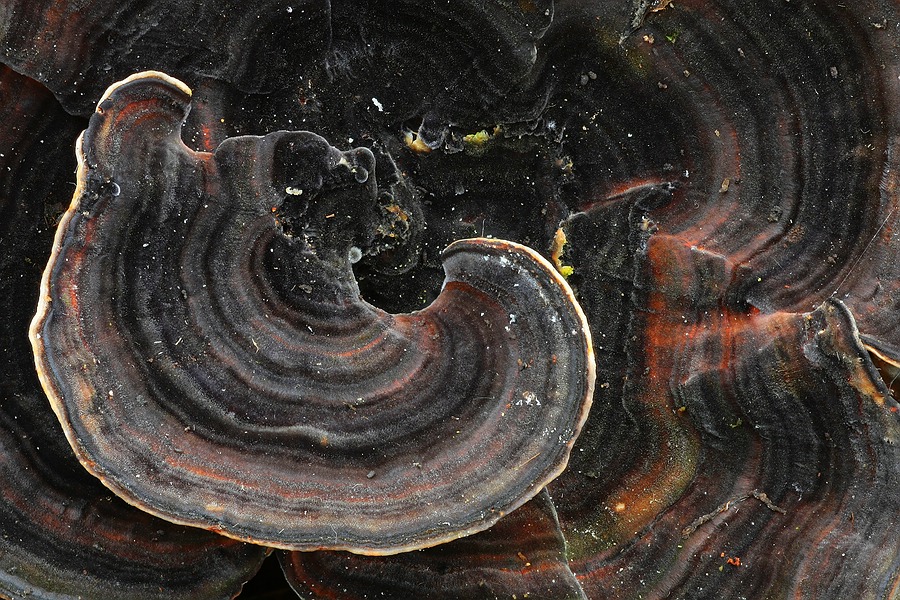Trametes versicolor (Schmetterlings-Tramete), Aufnahmedatum: 25.12.2009, Canon 450D mit Canon 100 mm EF 1:2.8 Makro, Pol-Filter, Stativ, manuell belichtet: 3.2 Sek., f/14, ISO 100, erstellt mit CZM aus 6 Einzelbildern