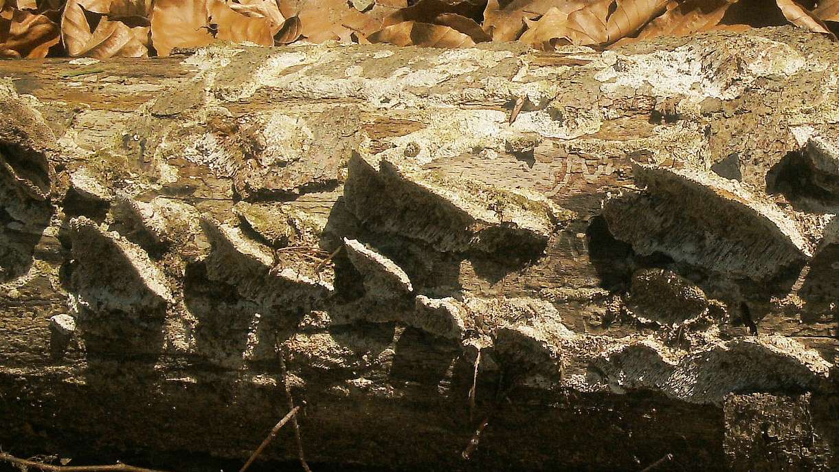 an liegendem großen entrindeten Laubholzstück (Buche?), Schnittkante