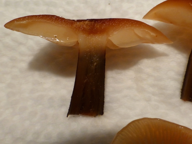 Kann es sein, dass sich der Stiel von unten nach oben dunkler färbt, wenn die Frucktkörper wachsen? Nicht dass ich zwei verschiedene Gattungen entdeckt habe...jedenfalls haben sie nichts Längsfaseriges oder Genattertes am Stiel. Tja, vorher war ich mir so sicher. :rolleyes: