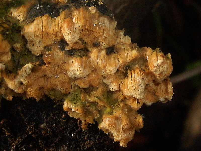 Der Pilz befand sich flächig auf der Borke, die sich bereits ablöste, bildete dort wenige mm vorstehende Minihütchen aus. (Zum Fotografieren habe ich ein Stück Borke entfernt)