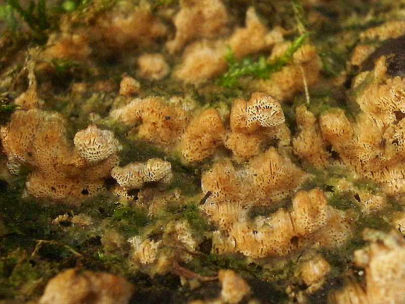 Fundort wiederum Laubmischwald Hochrhein, ca. 400 m, jetzt im Dezember, liegender (auf anderem Geäst -"freischwebend") bemooster Laubholzstamm (vermutlich Buche), Begleitpilz u.a. Schmetterlingstramete.