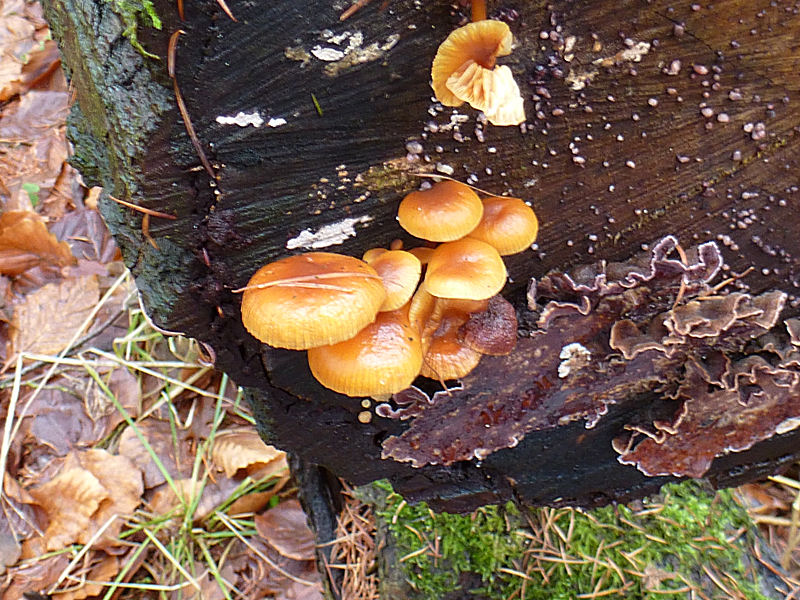 5 Samtfußrüblinge mit Chondrostereum purpureum (Violetter Knorpelschichtpilz) (wieder danke an ingo) wo ist denn da was violett?? *kopfkratz*