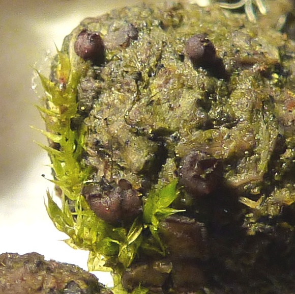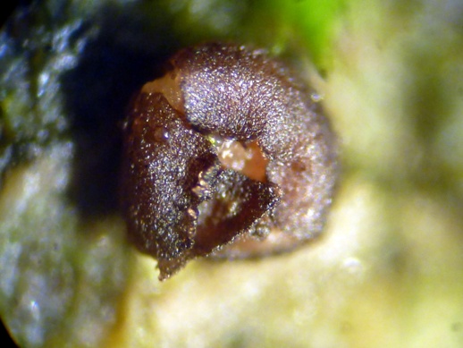 Die Apothecien sind außen dunkel Bronzefarben. Sie haben große, überstehende Ränder, die bei jungen Apothecien die Fruchtschicht wie Blütenblätter bedecken. Drum hatte ich das auch zuerst für anhaftende Samen oder vertrocknete Blütenknospen gehalten. Erst bei einem älteren Exemplar hab ich dann die Fruchtschicht mit den hervorstehenden Ascusspitzen gesehen.