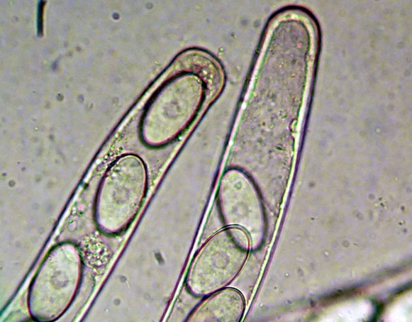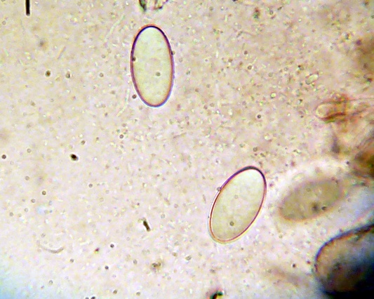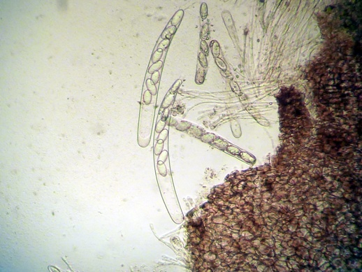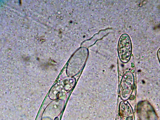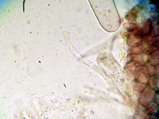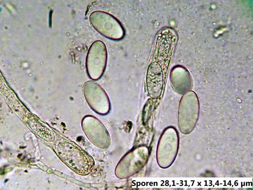 Möglich ist auch, dass es sich um eine Mißbildung handelt, oder ein Trockenschaden vorliegt. Keine Ahnung. Auffallend sind jedoch die enorm großen Sporen, die ich - ohne Berücksichtigung des makroskopischen Anscheins - auch nicht zuordnen kann.