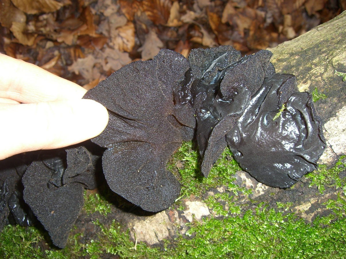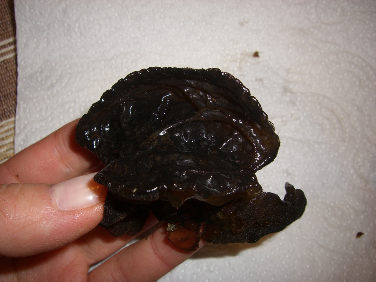 Die Pilze sind ebenfalls gallertartig, feucht, sind aber viel dunkler als die anderen (dunkel braun bis schwarz). Durchmesser des Pilzkörpers varriert von ca. 1 cm bis zu ca. 7 cm. Die Pilze sind meist verwachsen, Geruch angenehm, etwas süßlich. Die Konsistenz des Pilzes ähnelt Schmutzbecherling, es färbt aber nicht ab.