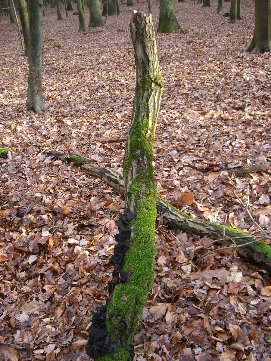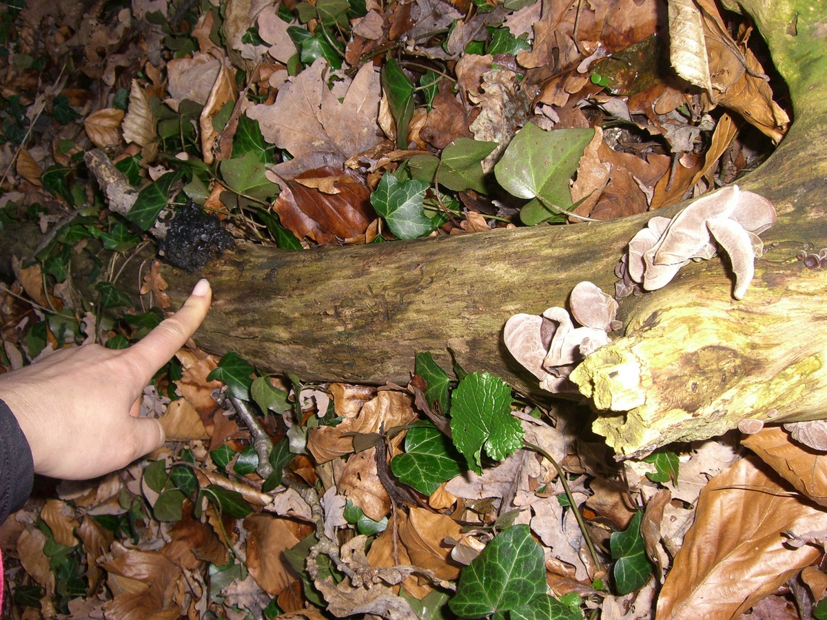 An einem Stamm habe ich beide Pilze gefunden (oder etwas ähnliches in schwarz - siehe dort wo ich mit dem Finger zeige; dieser schwarzer Pilz war fast zerfallen, nicht mehr ohrlappenförmig, nähere Fotos von dem Pilz sind leider nichts geworden):