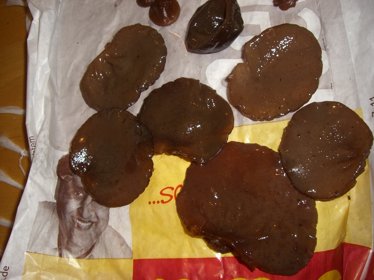 b) manche sind aber viel dicker (0,5 cm), meist rund, ganz flach (!) und ohne Falten. Sie sind sehr weich, voll mit geleeartiger Substanz gefüllt und sehen (insb. ganz junge Pilzkörper) für mich etwas nach Drüslingen aus.