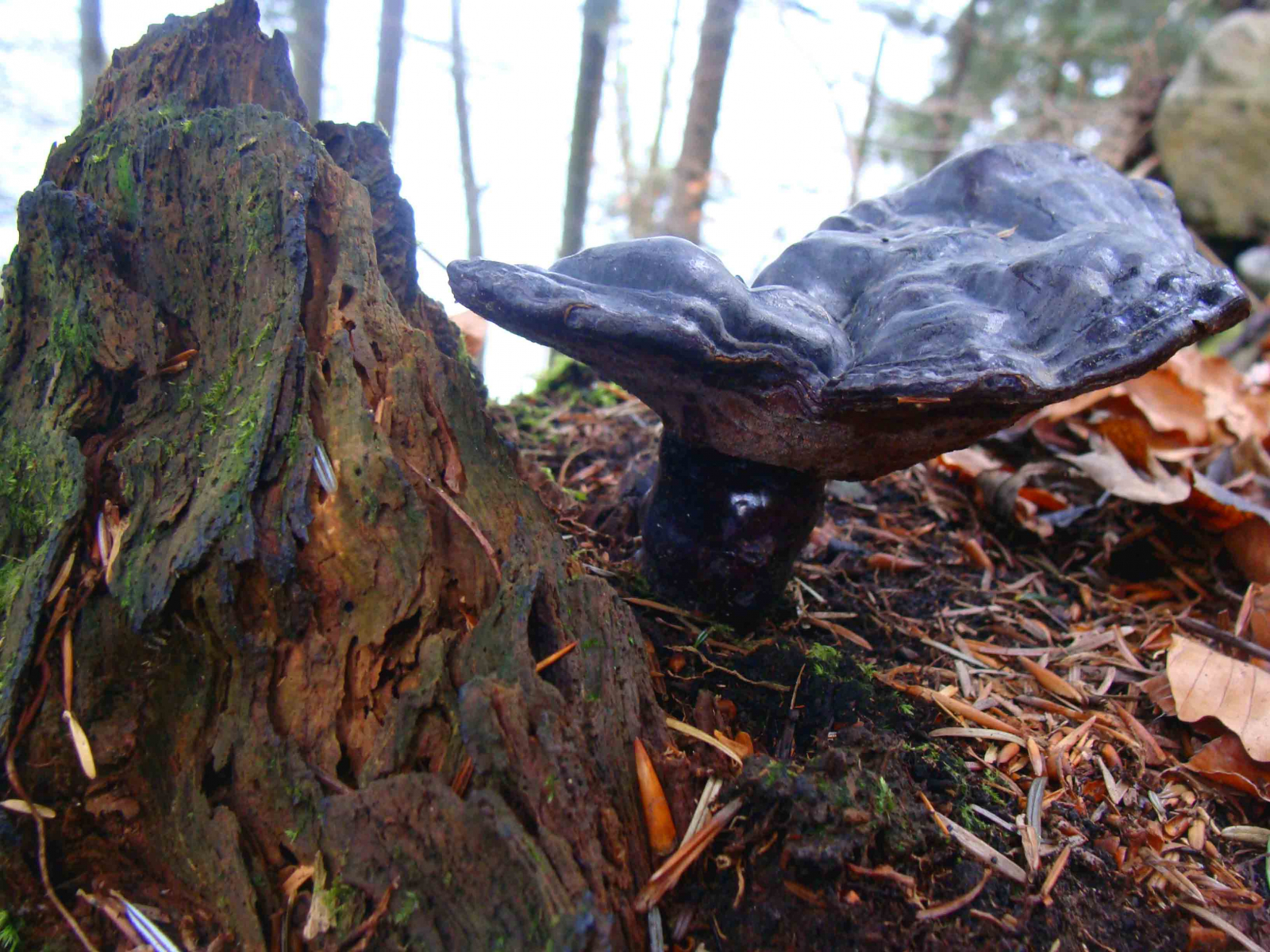Nun habe ich aber Zweifel weil die Farbe des Pilzes vom Stamm weg über den Hut einfarbig fast schwarz, pupur sehr dunkel durchscheint. Keine Wachstumzonen vorhanden. Deshalb habe ich die Vermutung, dass es sich um einen sehr alten Reishi handeln könnte. Auch die Poren sind recht dunkel, braun fast goldig schimmernd.