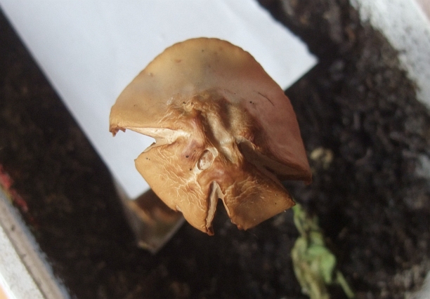 Der alte Pilz hat mittlerweile ganz schlapp gemacht, dafür wachsen da jetzt 2 neue. Mache nachher nochmal Fotos.