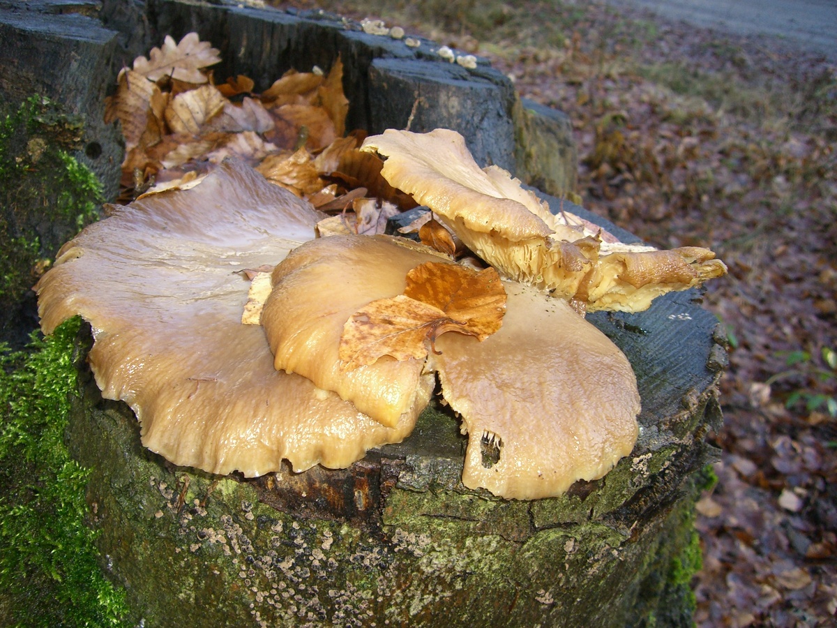 Sie waren aber um vielfaches größer als die von mir gestern gefundenen Seitlinge. Durchmesser der Pilzkörper betrug mind. 20 cm (meine Hand passte komplett darauf). Die Hutseite der Pilze war noch ziemlich fest, generell waren aber die Pilze brüchig und durchnässt (mit Sicherheit sehr alt und hatten mehrmals auf- und abgetaut). Die Pilze wuchsen auf der Schnittfläche eines Laubbaums (vermutliuc Buche). Es waren insg. nur drei große Fruchtkörper da.