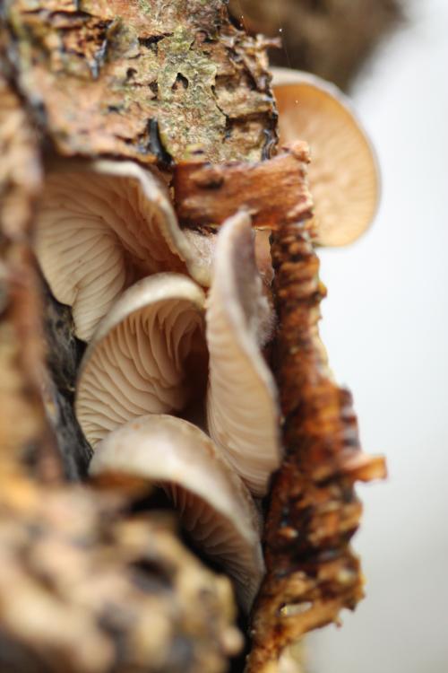 9: Und weiter gehts mit Gelbstieligen Muschelseitlingen an einem alten abgestorbenen Stamm (vermute entweder Ulme oder Weide). Die hier haben noch ein bisschen Arbeit vor sich beim Rindensprengen...
