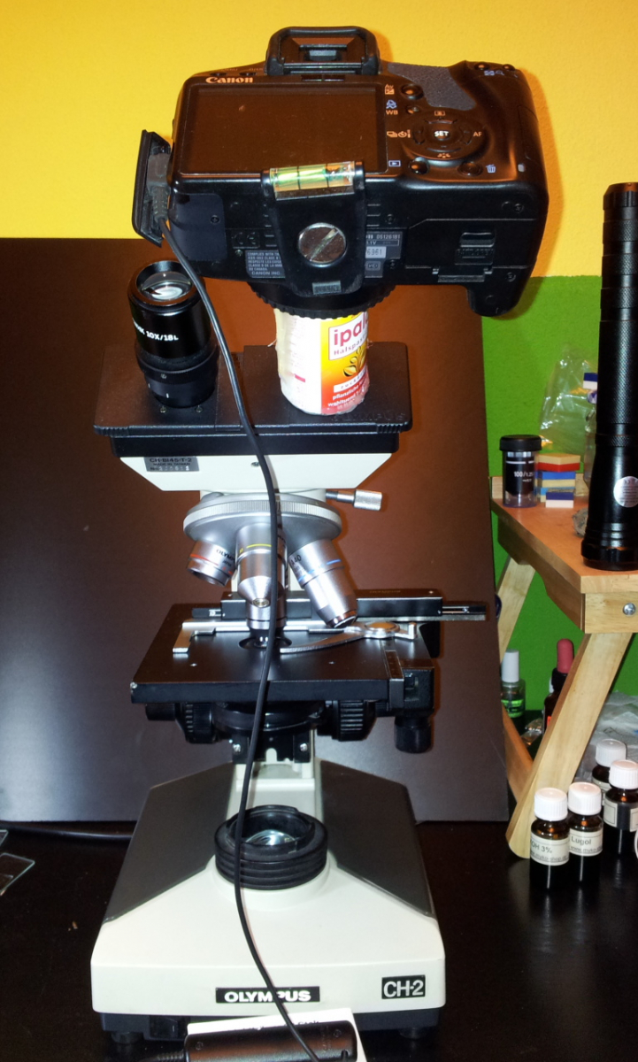 Ich hab mir einen Adapter gebastelt,womit ich die Kamera ohne Objektiv auf dem Mikro verwenden kann. Schaut dann so aus.Mfg Sven