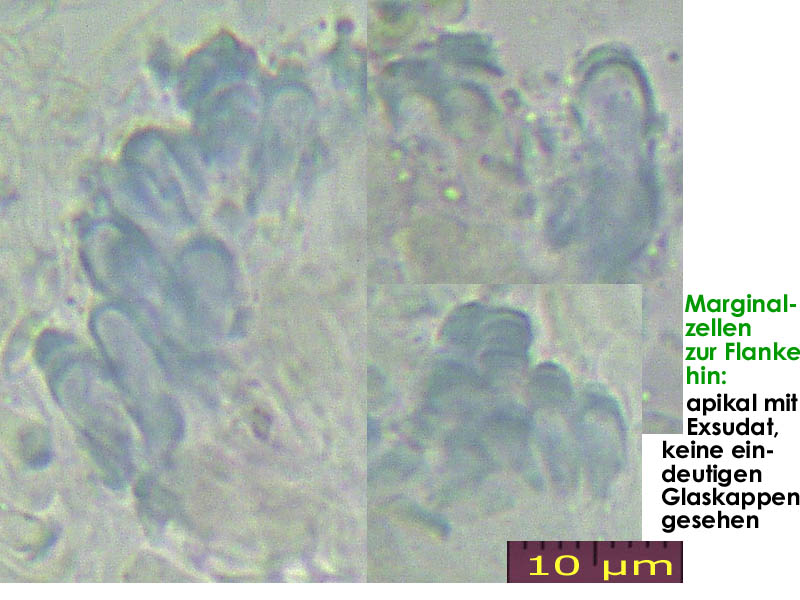 Die Glaskappen (glassy processes) sind irgendwie glasige Aufsätze auf den Zellen im Randbereich, die sich kaum anfärben lassen, irgendwas Massives, was sich aus den Zellen schiebt(?). Im Mikro sieht man so einen gestaffelten Aufbau nach oben, ähnlich wie Jahresringe, lässt sich meist nicht gut darstellen. Muss irgendwas Härteres sein, denn nicht KOH-löslich.