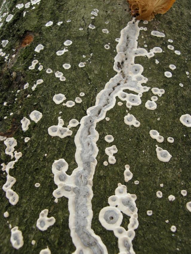 Heute waren wir mal nicht in die Pilze, sondern an ´s Wasser. Belohnt wurden wir mit einer putzmunteren Robbe. Aber auf dem Rückweg dann dieser nicht zu übersehende Pilz. Ein toter Ast an Eiche, in nicht für mich erreichbarer Höhe. Kann nur diese Bilder bei max. Zoom liefern. Der Pilz ist nur an der Unterseite gewachsen. Bis jetzt verdächtige ich den Eichenzystenrindenpilz (Peniophora quercina). Kann das jemand bestätigen oder ist das falsch???