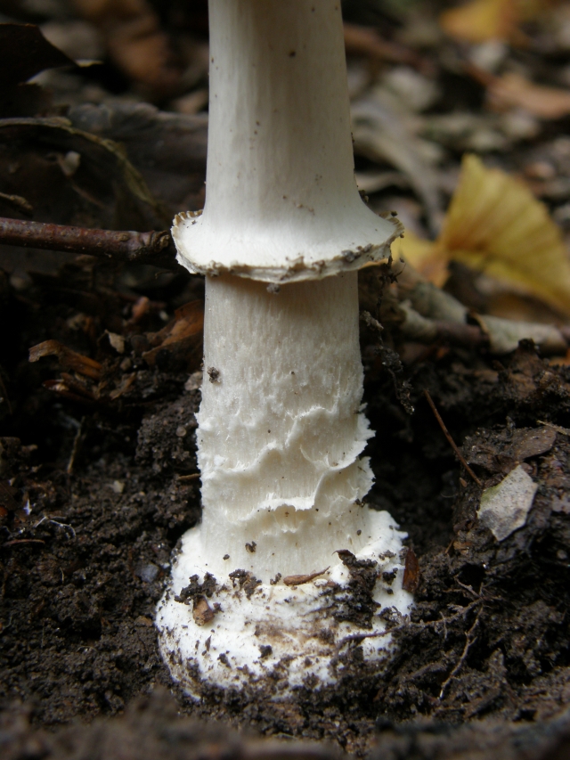 Stiel: Weiß, vom Ring zur Basis zunehmend beflockt (im Alter vergänglich); Ring abstehend bis hängend, ungerieft, weiß; Knolle eingepfropft, wulstig gerandetdarüber meist eine bis mehrere Gürtelzonen (–žBersteigersocken–œ); bis 12 cm lang