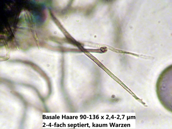 Auch gelingt es mir nicht, eine schmälere Seitenansicht der Sporen zu finden. Entweder bin ich zu blöd, oder die Sporen sind m.o.w. rundlich im Querschnitt. Die Sporenmaße sind mit den vorherigen im Einklang.