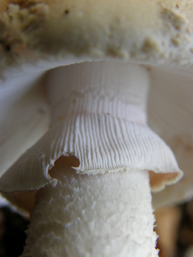 Stiel: Weiß im Alter mehr und mehr rosarötlich einfärbend, oft fleckig; von sehr unterschiedlicher Statur (stämmig bis schlank); unter dem Ring flockig / feinschuppig bis genattert; Ring vergänglich, hängend, Oberseite gerieft, die Riefung zieht sich bisweilen bis zur Stielspitze; Knolle nicht abgesetzt, fließender Übergang zwischen Knolle und Stiel, nur von teils undeutlichen Warzenringen gekennzeichnet.