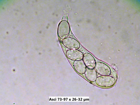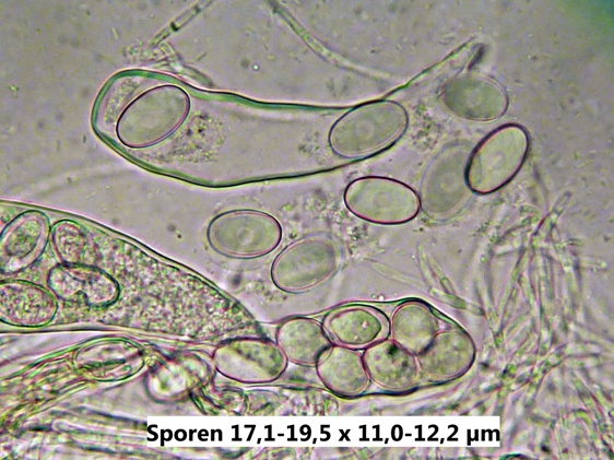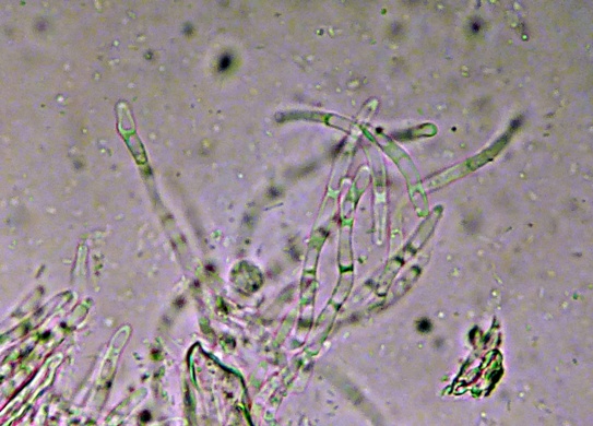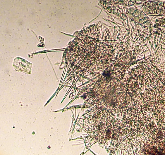 nobi_†: Ich habe heute sowohl die Unguiculella als auch die Trichobolus bis ins kleinste Detail und darüber hinaus untersucht, und bei mehreren Proben der Trichobolus gab es diese merkwürdigen "Sporen", die möglicherweise eine Art Konidien darstellen. Sie befinden sich teilweise im Exzipulum oder auf der Außenseite der Fruchtkörper und scheinen an Hyphen befestigt zu sein. Die "Konidiensporen" sind spindelig und bis etwa 30 µm lang, an einem Ende befindet sich eine kugelartige Verdickung und es sind normalerweise 4 Septierungen zu sehen.