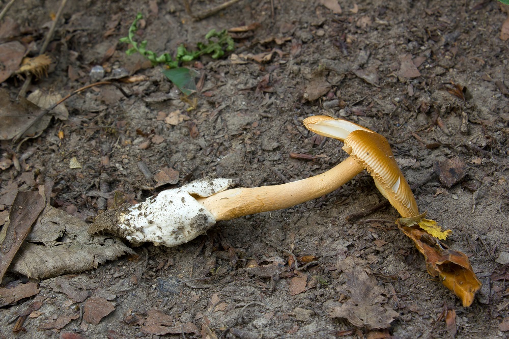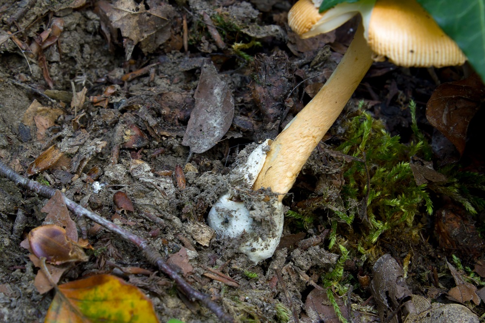 • Heute ist mir gleich zweimal ein anderer Pilz (als der Amanita crocea ähnlich) aufgefallen. Beide male war es ein Grauer Wulstling mit schwächlicher Statur. Genauso hätte es aber auch ein Knolli sein können. Die wachsen auch mal schmächtig.