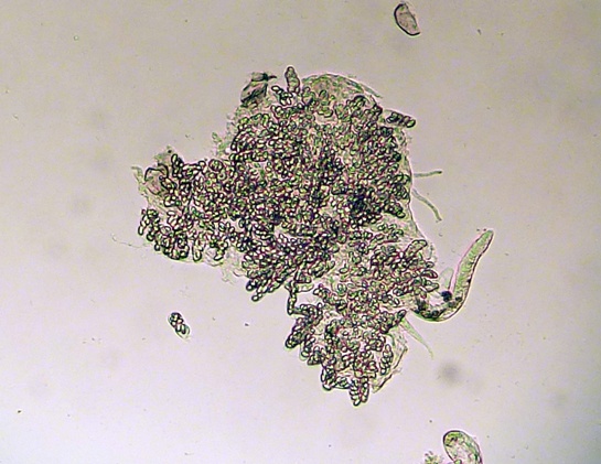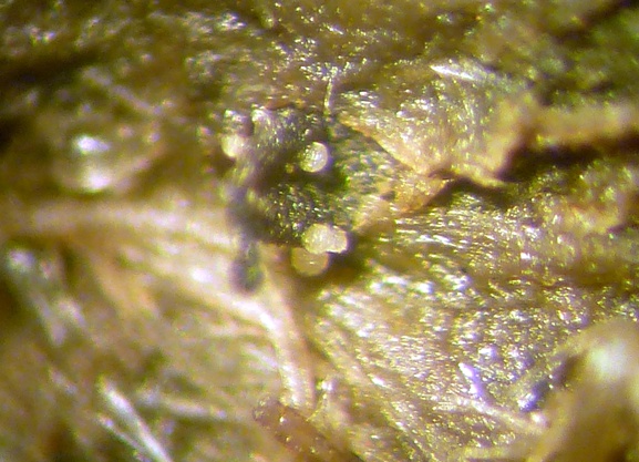Unscharfe Asci und apikal verjüngte und gekrümmte Haare im Hintergrund:
