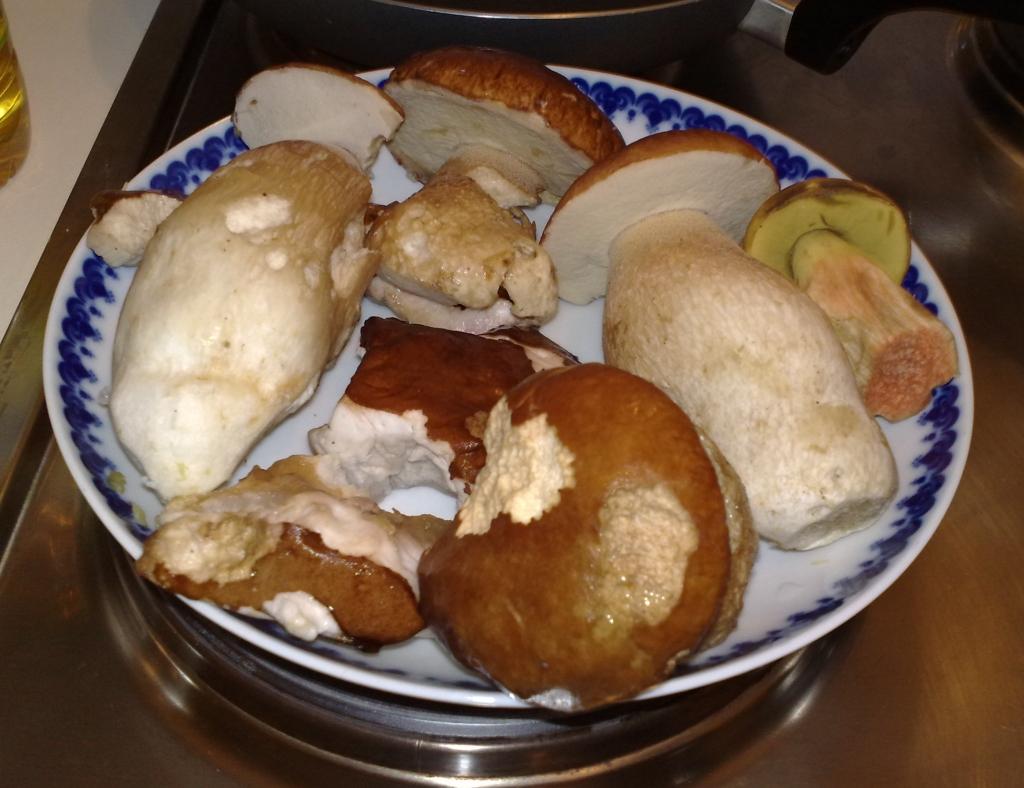 Endlich tut sich auch im Süd-Westen was: Nach dem schwülwarmen Wetter und den darauf folgenden Regenschauern in den letzten Tagen habe ich mich mal wieder in den Wald gewagt, leider ohne Kamera-(Handy). Es hätte sich aber gelohnt, eine Menge Steinis sind aus dem Boden geschossen, optisch teils top aber im Stiel meistens vermadet, für ein dickes Baguette hat es trotzdem gereicht. Andere Pilzarten waren sonst kaum zu finden, kann mir aber recht sein wenn von nun an nur noch Steinis wachsen sollten. Der Pilz auf der rechten Seite vom Teller ist mir leider noch unbekannt. Im Schnitt wird er an der Luft orange, der Schwamm ist gelb und der Hut auch orange. Naja, er hat lecker gerochen und deswegen habe ich ihn gerade mit den anderen verputzt ;-).