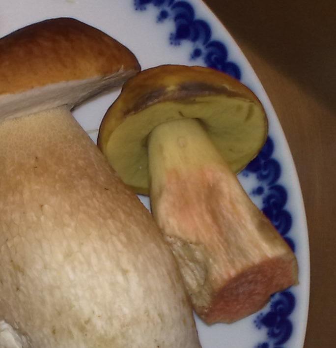 Der Hut von dem mir unbekannten Röhrling mit der orangenen Schnittfläche war überhaupt nicht rissig, optisch wie ein Steinpilz, nur der Hut ging in's orangene und das Futter war gelb.