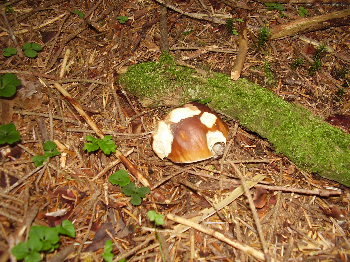 Der erste Steinpilz hat eine eingedrückte Stelle oben links. Irgend jemand oder irgend etwas hat ihn umgestoßen, er lag zumindest am Boden.