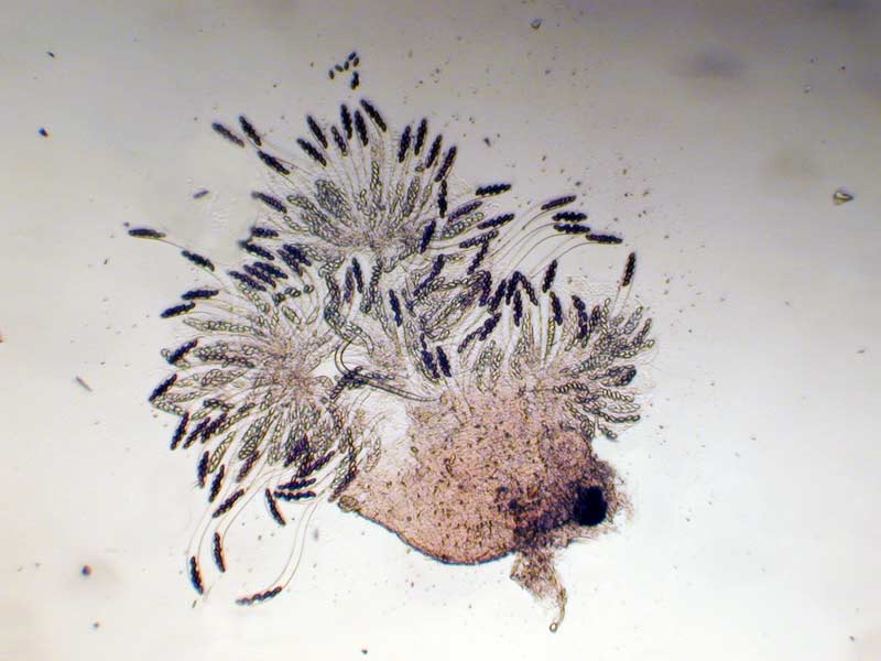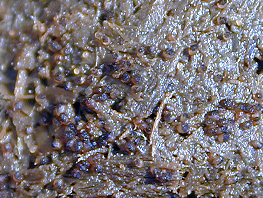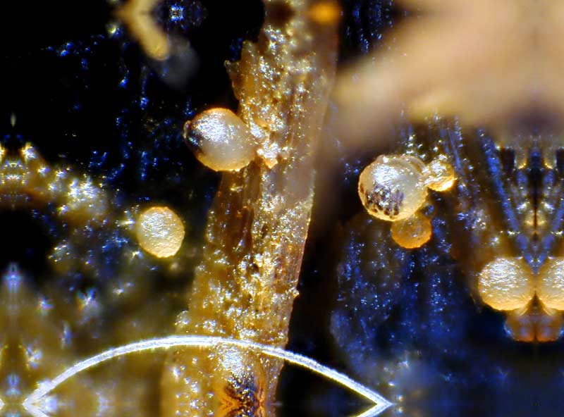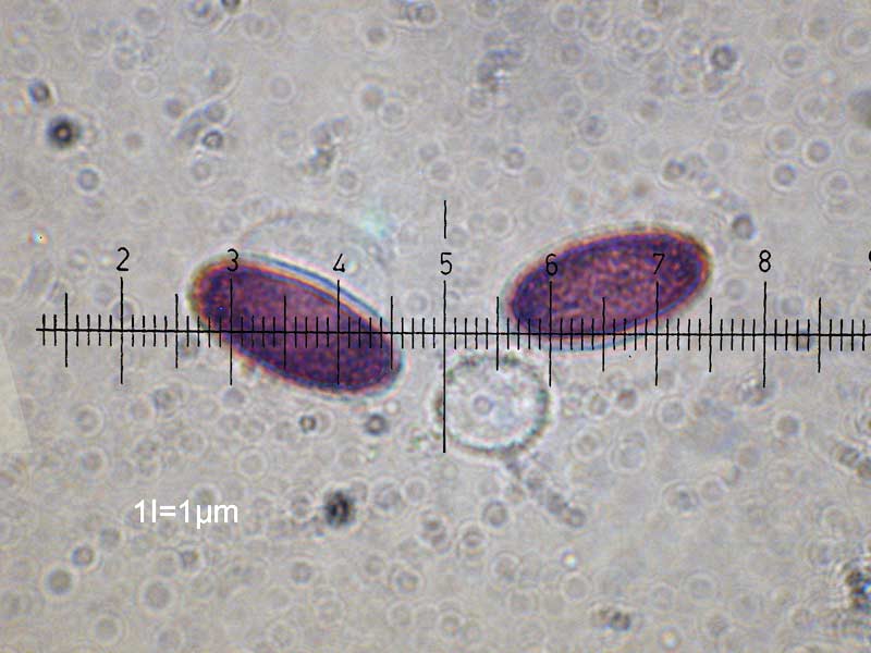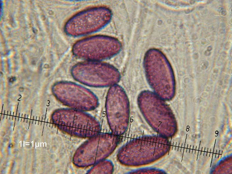 Ich habe hier auf Eseläpfeln (auch hier weiß ich nicht, ob man das so sagen kann) viele winzige Ascobolusse, die, nachdem sie erst milchig, weißlich durchsichtig waren jetzt nach dunkelgelb verfärben. Ich kann mit den diverser Literatur nicht anders als schließen, dass es hier um Ascobolus mancus geht. Ich lasse mich haber auch gerne belehren. Die gemessenen freien Sporen waren 18-20 X 8-9 µm.