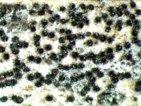 Ansonsten ist der Fruchtkörper ein rundes bis pyramidales Perithezium mit kleinzelliger, etwa 7-10 µm dicker Wand. Die Breite der Fruchtkörper bemisst sich auf etwa 60-80 µm. Das dürfte etwa 1/20 der Größe von einem Punkt in diesem Text sein.