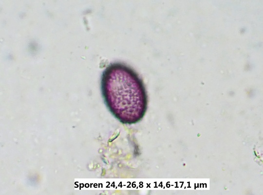 Erkennbar an den überwinzigen Apothezien, die etwa 0,15 mm breit sind und somit noch weit unter dem für Ascobolus albidus üblichen Bereich liegen. Solche Apothezien mit nur wenigen, vorstehenden Asci kommen bei A. stictoideus, A. degluptus und A. hawaiiensis in Frage, die alle elliptische, ornamentiere Sporen aufweisen (warzig-punktiert).